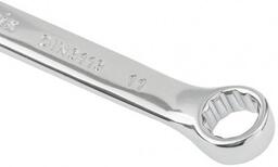 - Прочие особенности и свойства Ключ изготовлен из хромованадиевой стали. Твердость материала рабочей части ключа 45 HRC (требования ГОСТ – 45–51 HRC). Ключ имеет полированное хромоникелевое покрытие. Профиль кольцевого зева имеет 12 граней, что увеличивает площадь соприкосновения рабочих поверхностей и снижает риск деформации граней крепежа при монтаже. Угол наклона кольцевого зева относительно плоскости ключа в 15 градусов делает монтаж более удобным. Ключ гаечный комбинированный с открытым и кольцевым зевом предназначен для монтажа (демонтажа) резьбовых соединений.