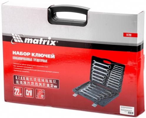 - Прочие особенности и свойства Ключ гаечный комбинированный с трещоткой предназначен для эффективного откручивания или закручивания болтовых соединений в труднодоступных местах. Особенности Ключ изготовлен из высококачественной стали 40CrV1 Имеет хромоникелевое антикоррозионное покрытие Твердость материала храпового механизма 58 HRС Профиль накидной части ключа имеет 12 граней Храповый механизм 72 зуба Минимальный угол поворота ключа 5 градусов Преимущества Работа в труднодоступных местах Увеличенная площадь соприкосновения рабочих поверхностей Легкий ход трещотки Быстрый и удобный монтаж резьбовых соединений. Комплектация Ключ комбинированный трещоточный 6 мм - 1 шт. Ключ комбинированный трещоточный 7 мм - 1 шт. Ключ комбинированный трещоточный 8 мм - 1 шт. Ключ комбинированный трещоточный 9 мм - 1 шт. Ключ комбинированный трещоточный 10 мм - 1 шт. Ключ комбинированный трещоточный 11 мм - 1 шт. Ключ комбинированный трещоточный 12 мм - 1 шт. Ключ комбинированный трещоточный 13 мм - 1 шт. Ключ комбинированный трещоточный 14 мм - 1 шт. Ключ комбинированный трещоточный 15 мм - 1 шт. Ключ комбинированный трещоточный 16 мм - 1 шт. Ключ комбинированный трещоточный 17 мм - 1 шт. Ключ комбинированный трещоточный 18 мм - 1 шт. Ключ комбинированный трещоточный 19 мм - 1 шт. Ключ комбинированный трещоточный 20 мм - 1 шт. Ключ комбинированный трещоточный 21 мм - 1 шт. Ключ комбинированный трещоточный 22 мм - 1 шт. Ключ комбинированный трещоточный 23 мм - 1 шт. Ключ комбинированный трещоточный 24 мм - 1 шт. Ключ комбинированный трещоточный 27 мм - 1 шт. Ключ комбинированный трещоточный 30 мм - 1 шт. Ключ комбинированный трещоточный 32 мм - 1 шт.
