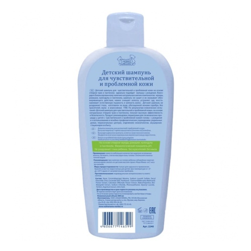 Специальная увлажняющая формула шампуня бережно очищает волосы без травмирующего обезжиривающего воздействия на сухую, тонкую и проблемную кожу. Активные натуральные экстракты череды, ромашки, календулы и Д-пантенол в составе способствуют снятию воспалений, нормализации и поддержанию оптимального кожно-жирового баланса кожи головы, питают и укрепляют волосы. Обогащен ионами серебра, обладающими выраженными обеззараживающими свойствами. Придает волосам естественную пышность и мягкость. Не содержит консервантов, неразрешенных европейскими регламентами для смываемой и несмываемой детской косметики. Гипоаллергеннен, проверено клинически и рекомендовано в педиатрической практике. Не раздражает глазки, не вызывает слез при купании.