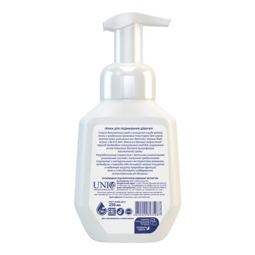Самый деликатный уход и очищение в виде мягкой пенки с воздушной кремовой текстурой для самой нежной кожи интимных зон девочек с первых дней жизни и до 8-9 лет.