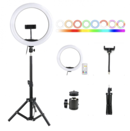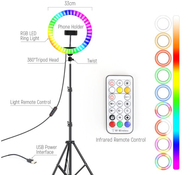 кольцевой светодиодный селфи светильник 33 см, RGB, со штативом – невероятно красивый аксессуар для создания красивых фотографий на мобильный телефон. Большая кольцевая лампа 33 сантиметра может давать поток света разного света, в дополнение к фильтрам вашего смартфона. 10 различных красочных оттенков, сила света и интенсивность выбираются и управляются с небольшого пульта дистанционного управления. Кольцевой светильник на штативе держателем телефона имеет внешний диаметр 33 сантиметра, внутренний диаметр 25 сантиметров. В этом плафоне содержится 70 RGB ламп и 168 белых. Работать они могут автономно. Поэтому и для управления кольцевым светодиодным селфи светильником 33 см, RGB, со штативом используется пульт дистанционного управления с раздельными областями. Обратите внимание на 2 кнопки включения – верхняя включает обычный свет. Есть регулировка яркости, 10 уровней и 3 цвета оттенка – белый, желтый, «теплый».