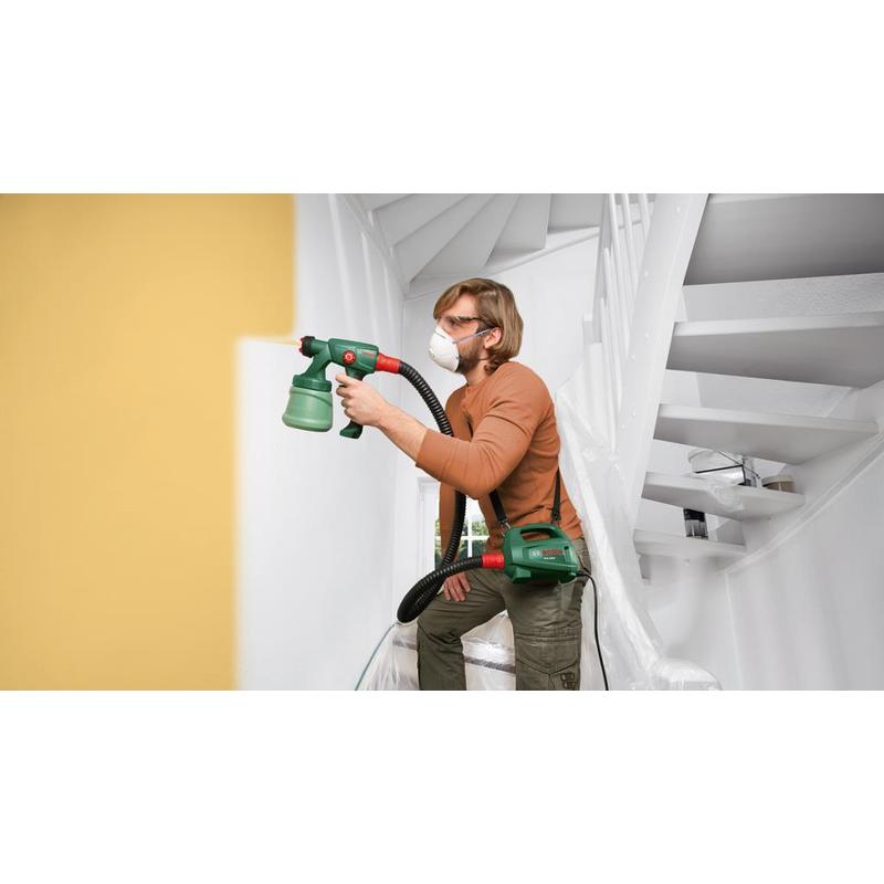 Краскопульт Bosch PFS 2000 подходит для проведения лакокрасочных работ на небольших поверхностях. Он обеспечивает равномерное и тонкое покрытие любой поверхности от дерева до металла. Избежать пятен и наплывов помогает точное настроечное сопло и регулятор плотности распыления. С краскораспылителем любая работа по декорированию, лакированию, пропитке маслом или косметическому ремонту производится в разы быстрее и аккуратнее, чем при помощи валиков и кистей.Выходное сопло имеет три сменных режима работыС помощью поворотного механизма насадки можно выбрать вертикальное, горизонтальное или круговое распыление. Это дает возможность подобрать подходящий режим распыления для конкретной поверхности и типа используемого покрытия.Настраиваемая плотность распыленияПри помощи кругового переключателя на корпусе можно настроить плотность подачи эмульсии. Технология EasySelect обеспечивает равномерную подачу того количества краски, которое необходимо для создания слоя требуемой толщины.Удобное расположениеКонструкция корпуса подразумевает удобное наплечное крепление нижней части краскораспылителя. Базовый блок соединяется с распылителем гибким шлангом, что упрощает маневрирование во время окрасочных работ. Широкий ремень позволяет освободить руки и переносить аппарат, не прикладывая особых усилий.