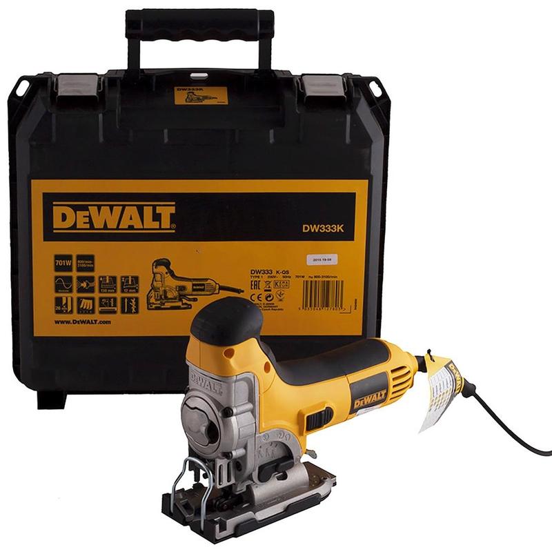 Электрический лобзик DeWALT DW 333 K — полезное оборудование для профессионалов и рядовых владельцев. Он оснащается мощным двигателем, поддерживающим высокую скорость резки при работе с различными материалами.Лобзик DeWALT DW 333 K имеет систему плавного запуска. Разгон двигателя происходит постепенно, благодаря чему снижается нагрузка на важные компоненты инструмента. Лобзик прослужит значительно дольше и не будет выходить из строя.Электрическая энергия поступает от розетки. Сетевой кабель обладает длиной 4 метра. При работе можно удалиться от розетки, шнур не будет вызывать дискомфорт у владельца. Хранить оборудование и переносить его предлагается в комплектном кейсе.Частота движения пильного полотна регулируется, адаптируется под конкретный материал. Доступные значения — 0-3100 ходов в минуту. Для фиксации пилки используется быстрозажимное крепление, оно обеспечивает простоту замены полотна.Рукоятка имеет грибовидную форму, а прорезиненое покрытие увеличивает надежность фиксации в ладони. Вы будете полностью контролировать лобзик при работе. Предусмотрен сдув опилок, дополнительно поддерживается подключение пылесоса для их сбора.