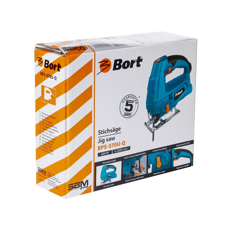Электрический лобзик BPS-570U-Q имеет новейшие технические решения для удобной и продуктивной работы. Купив электрический лобзик Bort вы получаете гарантию, что купили технически совершенный и исправный электроинструмент. Дополнительные функции нашего инструмента помогут решить ряд задач по распилке ДСП, дерева, пластика и металла. Регулировка скорости электролобзика позволяет подобрать скорость движения пилки в зависимости от материала. Маятниковый режим помогает увеличить скорость пропила, но надо учитывать, что чистота реза при этом ухудшается. Быстрозажимной патрон удобен для быстрой бесключевой замены пильного полотна лобзика. В комплекте с электролобзиком BPS-570U-Q поставляется параллельная направляющая , есть возможность подключить строительный пылесос.