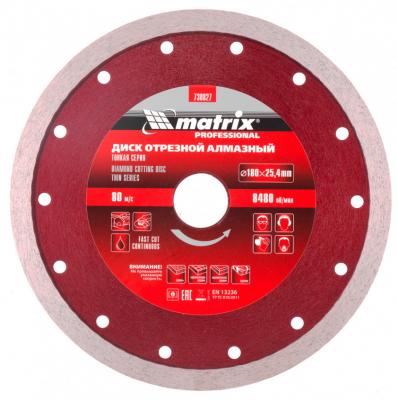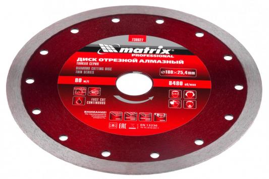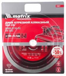 - Прочие особенности и свойства Диск алмазный TM Matrix изготовлен методом ускоренного горячего прессования, имеет увеличенный ресурс по сравнению с методом холодного прессования. Сплошной профиль и оптимально подобранная связка рабочего слоя позволяет делать качественный и точный рез без сколов. Малая толщина диска обеспечивает меньшие нагрузки на электроинструмент, также скорость реза на 15-20 % выше. Благодаря новой технологии изготовления стоимость значительно ниже по сравнению с классической технологией горячего прессования. Предназначены для резки керамогранита, керамической плитки, камня, стекла, мрамора, и других твердых природных и искусственных материалов. Во время работы необходимо использовать водяное охлаждение режущей части диска. Предназначен для установки на электрические плиткорезы, УШМ с посадочным диаметром 25,4 мм.