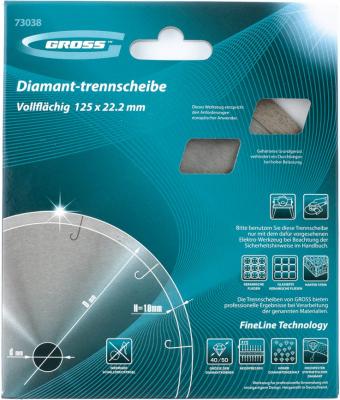 - Прочие особенности и свойства Алмазный диск размером 125 х 22,2 мм торговой марки GROSS предназначен для резки «мокрым методом» (с подачей охлаждающей жидкости) изделий из твердых материалов: бетона, мрамора, шлакоблоков и гранита. Режущий слой диска высотой 10 мм содержит большое количество синтетических алмазов диаметром 40–50 мкм, которые обеспечивают эффективность проводимых работ и повышают износостойкость диска.