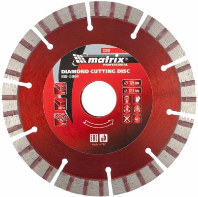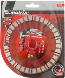 - Прочие особенности и свойства Диск алмазный отрезной турбо-сегментный MATRIX 73142 используется совместно с угловыми шлифовальными машинами для сухого реза бетона, кирпича, природного камня. Режущие сегменты нанесены методом холодного прессования на стальное основание диска. Форма оснастки обеспечивает высокую производительность и эффективное удаление шлама из зоны резания.