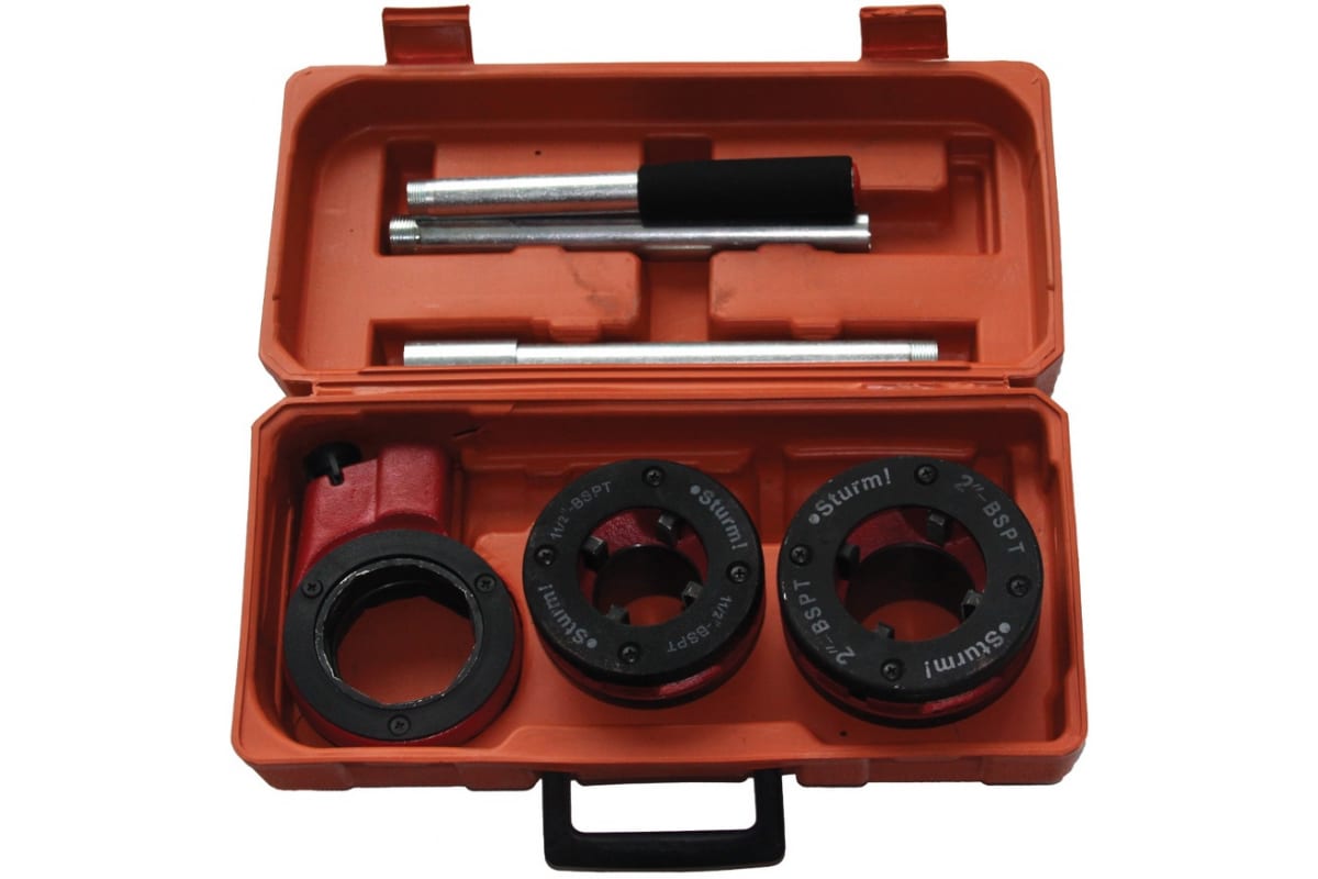 Набор резьбонарезных инструментов Sturm 1065-03-S2 состоит из трех предметов, которые применяются для нанесения резьбы на трубы из цветного металла и тонкой стали диаметром 1 1/2" ,2". Материал, из которого изготовлены все предметы, имеет повышенный срок службы. Для удобства хранения и транспортировки набор поставляется в пластиковом кейсе.