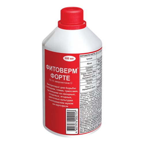 Концентрированный Фитоверм Форте удобен для больших площадейвсе преимущества Фитоверма сохранены: безопасен, универсален, можно применять за 1-3 дня до сбора урожая Для чего и где применятьдля борьбы с комплексом вредителей: клещами, тлями, трипсами, паутинным клещом, колорадским жуком, листогрызущими гусеницамина овощах, картофеле, ягодных кустарниках, плодовых деревьях, цветах и других культурахв теплицах и открытом грунтеКак применятьопрыскивать растения при появлении вредителейДействие и результаткишечно-контактное действиепосле обработки вредители перестают питаться, повреждать растения, гибнут через 3-5 днейзащитное действие до 20 днейБезопасность и экология3 класс (умеренно опасное вещество)биопрепарат произведен почвенными микроорганизмаминаиболее безопасный инсектоакарицид