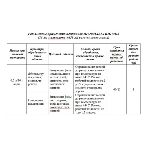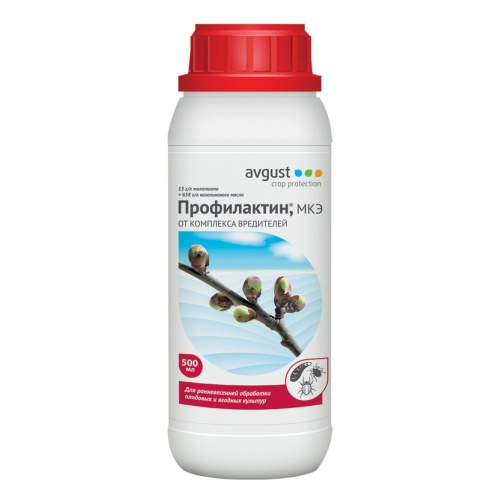 Обработки деревьев и кустарников Профилактином проводят до распускания почек, т.е. еще до того как вредители сада возобновляют свою жизнедеятельность после зимы. Такая профилактика очень эффективна и позволяет в значительной степени защитить урожай. Профилактин не токсичен для растений в рекомендуемых нормах расхода. Период его защитного действия составляет не менее тридцати суток.