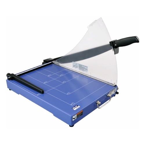 Профессиональная серия резаков: большой металлический стол с разметкой форматов; фиксация ножа в закрытом состоянии; защитный экран; упор для бумаги (ограничительная планка); ручка для переноски.