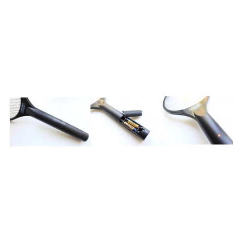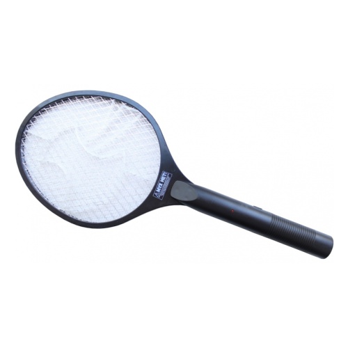 Самая простая и надежная в эксплуатации электрическая мухобойка с питанием от двух батарей типа АА (пальчиковые). Мухобойка выполнена в виде теннисной ракетки. В момент, когда насекомое попадает между электродными сетками с разной полярностью, возникает электрический разряд, который уничтожает его.