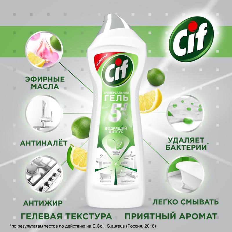 Какой бы сложной не была задача по уборке дома, обязательно найдется средство Cif, которое облегчит вашу жизнь и сделает окружающее вас пространство чистым и красивым. Благодаря уникальной формуле с особыми микрогранулами крем Cif эффективно справляется с самыми сложными загрязнениями, не повреждая поверхность и не оставляя на ней царапин! Мощная формула густого крема Cif легко справится с: стойкими кухонными загрязнениями (жир и пригоревшая еда); ржавчиной и известковыми отложениями; мыльным налетом. Крем Cif можно применять на различных поверхностях на кухне и в ванной комнате, а также он идеально подходит для чистки мангалов, шампуров, грилей, кастрюль и даже горшочков для тушения блюд. Все поверхности в доме засияют как новые, крем Cif легко вернет им первоначальную чистоту и сэкономит ваше время для более приятных занятий!Крем Cif всегда на страже чистоты вашего дома! Cif крем — очень успешный продукт. Среди тех, кто хоть один раз попробовал его в деле, само слово «крем» стало ассоциироваться с нашим средством. В чем секрет успеха? Cif — первый крем с уникальной формулой, содержащей мельчайшие микрогранулы, окруженные пузырьками. Такая формула позволяет эффективно справляться даже сильными загрязнениями поверхности и при этом не повреждать поверхность, не оставлять на ней царапин! Именно это, на первый взгляд удивительное сочетание мощности и деликатности, стало залогом такой популярности крема во всем мире.Способ применения: Используйте в разбавленном виде для пола: 2-3 нажатия (40 мл) продукта на 5 л воды. Не нужно смывать.Используйте в неразбавленном виде для других поверхностейЙ: нанесите небольшое количество прямо на поверхность или на тряпочку/губку, потрите и смойте водой. Для удаления стойких загрязнений нанесите средство и подождите несколько минут. Для устранения бактерий оставьте средство на 10 минут.Состав продукта:менее 5% анионные ПАВ, менее 5% гипохлорит натрия, менее 5% отдушка, менее 5% эфирные масл. аОсобенности состава:содержит эфирные масла.Противопоказания / Меры предосторожности: Хранить в недоступном для детей местеЕ. Перед использованием ознакомиться с маркировкой продукта. Не допускайте попадания на ткань, ковры, текстиль. Не использовать на окрашенной деревянной поверхности, после использования на окрашенной металлической поверхности немедленно смойте. Используйте на алюминиевых, мраморных поверхностях и линолеуме только в разбавленном виде. В случае незнакомого материала попробуйте продукт на незаметном участке поверхности.Не смешивайте с другими средствами во избежание образования опасного газа (хлора).Использовать перчатки и средства защиты лица и глаз.Использовать только в хорошо вентилируемом помещении.После работы тщательно вымыть руки.При проглатывании: Прополоскать рот. Не вызывать рвоту!При попадании в глазана кожу: Осторожно промыть глаза/кожу водой в течение нескольких минут. При необходимости немедленно обратиться за медицинской помощью, по возможности показать маркировку продукта.Хранить в вертикальном положении в удалении от источников тепла и прямого солнечного света.Условия хранения продуктов:Хранить в сухом защищенном место без воздействия прямых солнечных лучей при температуре от 0 до +25 °С.Срок годности 540 дней.