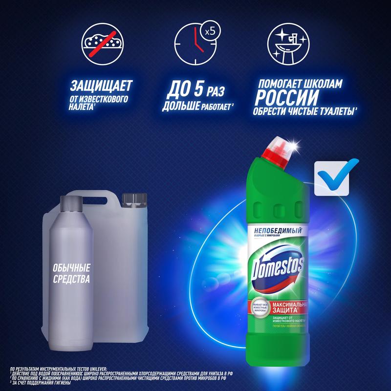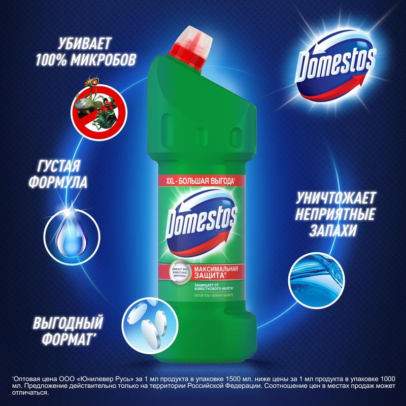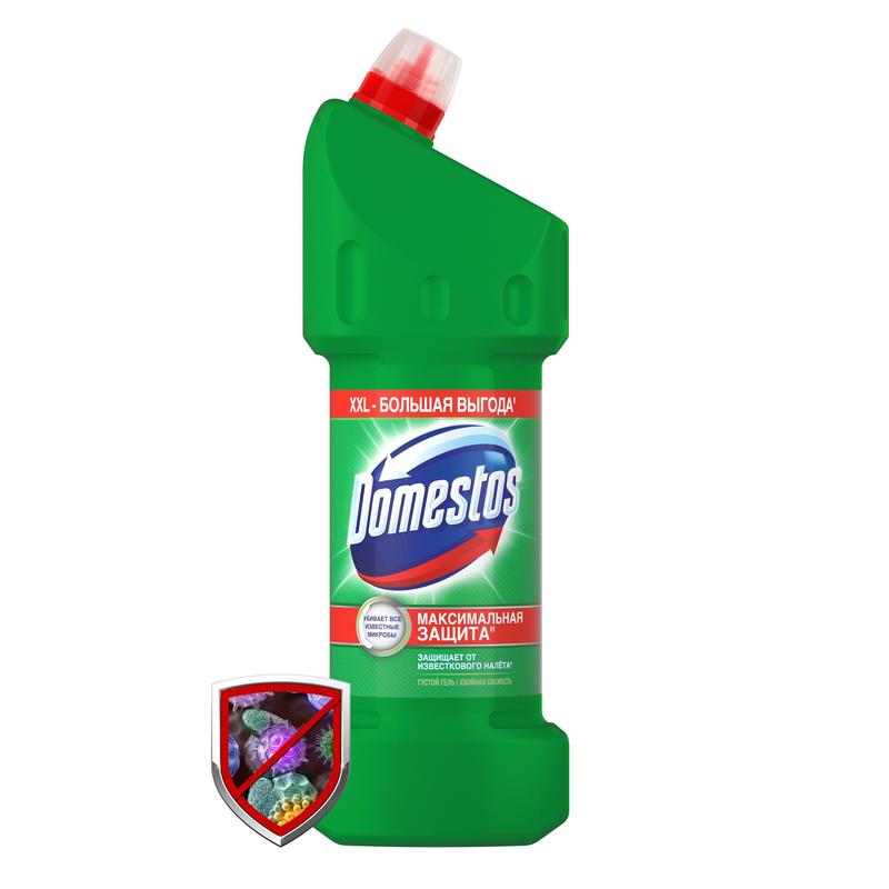 Средство для сантехники универсальное с усиленным дезинфицирующим эффектом Domestos XXL 1,5 л (в ассортименте).Универсальный гель Domestos Свежесть Атлантики и Domestos Хвойная Свежесть объемом 1500 мл убивает микробы, отчищает грязь, обладает густой текстурой и равномерно распределяется на поверхности унитаза. Удобный дозатор обеспечивают экономичный расход средства. Продукт можно использовать не только для гигиены ванной и чистки унитаза, но и для обработки поверхностей, мытья полов и кафеля. В неразбавленном виде бытовая химия подходит для унитаза, ванной, раковины и труб, а в разбавленном — для отбеливания вещей.НазначениеУниверсальное средство Domestos Свежесть Атлантики — это эффективный чистящий гель, который уничтожает 100% известных микробов во всем доме для защиты вашей семьи. Средство Domestos универсально и подойдет для уборки всего дома. В неразбавленном виде средство можно использовать для очищения и дезинфекции унитаза, ванны, раковины, стоков и сливов, а в разбавленном — для мытья множества поверхностей (пол, кафель, плитка, рабочие поверхности на кухне) и даже для отбеливания белья.Способ примененияКолпачок защищен от открывания детьми. Чтобы открыть, надавите на уплотнения по бокам колпачка и поверните против часовой стрелки. Чтобы закрыть, поверните колпачок по часовой стрелке до щелчка.Применение неразбавленным:— унитаз: нанесите Domestos под ободок унитаза (около 80 мл). Для максимального эффекта оставьте на ночь. Domestos отчистит грязь, устранит неприятные запахи и уничтожит микробы;— раковины и ванны: нанесите Domestos на поверхность и обработайте с помощью щетки. Через 5 минут тщательно смойте. Domestos отчистит грязь и уничтожит микробы, включая грибок;— сливы и водостоки на кухне и в ванной: налейте Domestos в сливное отверстие, оставьте на 5 минут, затем промойте водой.Применение разбавленным:— полы и рабочие поверхности: 4 колпачка Domestos на 5 л воды. Не используйте неразбавленным для мытья полов;— кафель: 4 колпачка Domestos на 5 л воды. Смочите губку в растворе и обработайте кафель. Domestos очистит поверхность и уничтожит микробы, включая грибок;— губки для мытья посуды: промойте в специальном растворе с дезинфицирующим эффектом: 2 колпачка Domestos на 3 л воды.Меры предосторожностиПеред использованием ознакомиться с маркировкой продукта. Использовать перчатки и средства защиты лица и глаз. Использовать только в хорошо вентилируемом помещении. Не вдыхать пары. После работы тщательно вымыть руки. При вдыхании: свежий воздух, покой. При проглатывании: прополоскать рот. Не вызывать рвоту! При попадании на кожу (или волосы): немедленно снять всю загрязненную одежду, кожу промыть водой или под душем. При попадании в глаза: осторожно промыть глаза водой в течение нескольких минут. Снять контактные линзы, если Вы ими пользуетесь и если это легко сделать. Продолжить промывание глаз. При необходимости немедленно обратиться за медицинской помощью, по возможности показать маркировку продукта. Хранить в недоступном для детей месте.Состав: < 5% гипохлорит натрия, анионные ПАВ, неионогенные ПАВ, мыло, отдушка.Условия храненияХранить в сухом защищенном месте без воздействия прямых солнечных лучей при температуре от 0 до 25 °С.Срок годности: 18 месяцев.ГОСТ/ТУТУ 2383-001-18359701-2015