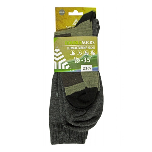 Комплект из 2-х пар носков Woodline Double комплект 2 пары до -35СВнутренний носок из тонкой шерсти для максимального «разогрева» ног. Внешний носок из Акрила (синтезированная шерсть) махровой вязки. Использование только внутреннего носка возможно в повседневной жизни, это тонки плотносвязанный шерстяной носок. Комфортная температура использования носка +5С - -5СИспользование только внешнего носка возможно как в прохладную погоду с тонкой обувью, так до -20С с зимней обувью.Оптимальное использование комплектом обе пары одновременно. С зимними трекинговыми ботинками до -20С. С сапогами из ЭВА до -35С