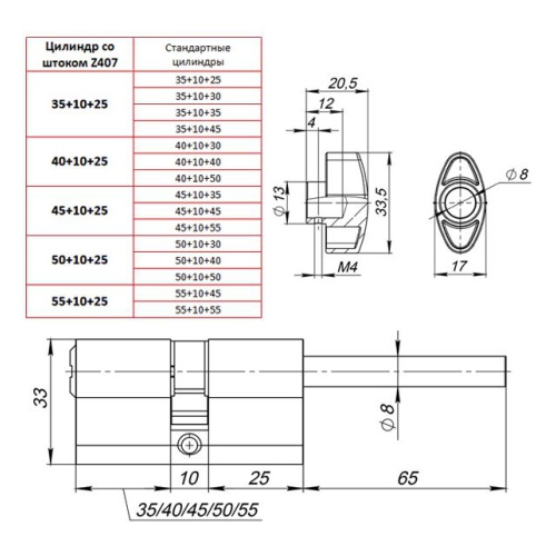 Цилиндровый механизм со штоком PUNTO Z407/70 mm (35+10+25) CP хром 5 кл. TD-37807