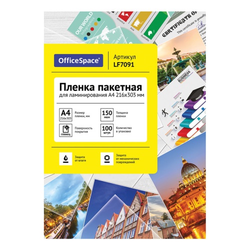 Пленка для ламинирования А4 OfficeSpace 216*303мм, 150мкм, глянец, 100л. 222555РЦ