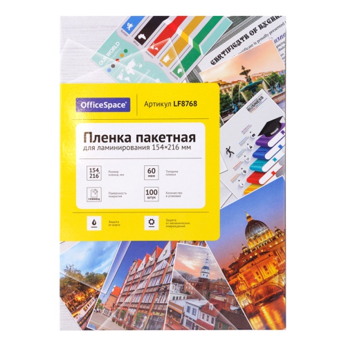 Глянцевая пакетная пленка OfficeSpace размером 154*216 мм и плотностью 60 мкм прекрасно подходит для ламинирования документов. Предназначена для использования в ламинаторах «горячего» типа. Придает документу жесткость, обладает высокой прозрачностью после ламинации, защищает документ от механических повреждений и воздействия влаги.
