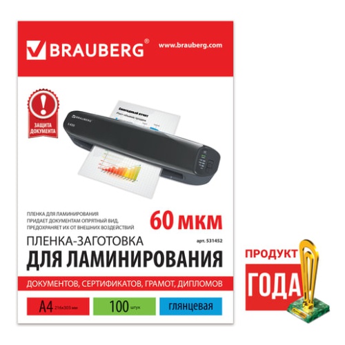 Пленка для ламинирования BRAUBERG А4, КОМПЛЕКТ 100 шт., 60 мкм 531452СН