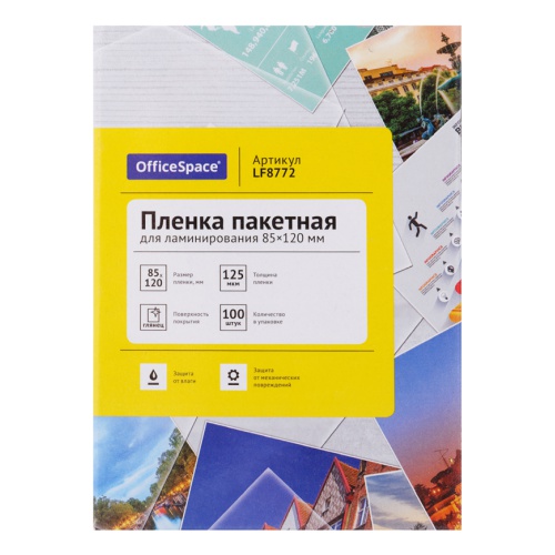 Глянцевая пакетная пленка OfficeSpace размером 85*120 мм и плотностью 125 мкм прекрасно подходит для ламинирования документов. Предназначена для использования в ламинаторах «горячего» типа. Придает документу жесткость, обладает высокой прозрачностью после ламинации, защищает документ от механических повреждений и воздействия влаги.