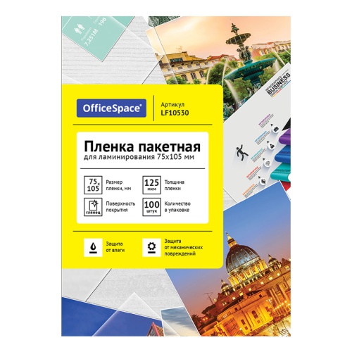 Глянцевая пакетная пленка OfficeSpace размером 75*105мм и плотностью 125мкм прекрасно подходит для ламинирования документов. Предназначена для использования в ламинаторах «горячего» типа. Придает документу жесткость, обладает высокой прозрачностью после ламинации, защищает документ от механических повреждений и воздействия влаги.