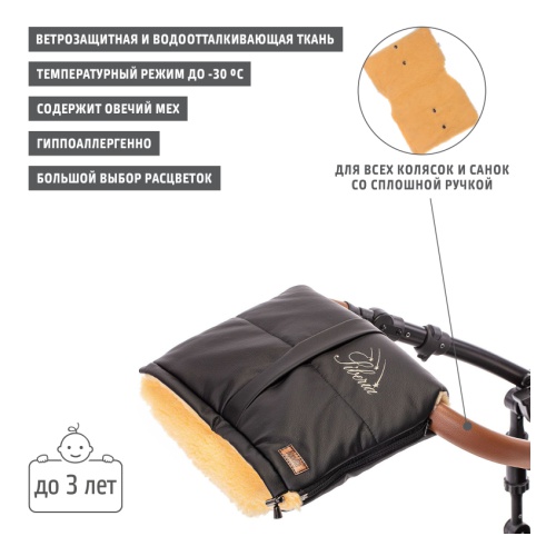 Меховая муфта NUOVITA SIBERIA LUX — практичный современный аксессуар для коляски, благодаря которому длительные прогулки с малышом в холодную погоду станут более комфортными для родителей. Она универсальна и подойдет ко всем видам колясок и санок, имеющих сплошную ручку.Внутри муфты находится высокий пушистый мех, который представляет собой смесовую овечью шерсть на текстильной основе. Он имеет высоту 12 мм и создает объемную воздушную прослойку, отлично удерживающую тепло даже при сильном морозе (изделие рассчитано на применение в диапазоне температур от 0 до -30 градусов). Наружная часть муфты изготовлена из экокожи. Данный материал эластичен, не застывает на морозе, а его микропористая структура пропускает воздух, не создавая «парникового эффекта». Между экокожей и мехом находится мягкая прослойка из синтепона.Муфта крепится на ручке коляски благодаря двум разъемным замкам, которые вшиты в боковые срезы. По краям предусмотрена окантовка, предотвращающая попадание меха в «змейку». По центру расположены две металлические кнопки, соединяющие верхнюю и нижнюю части. Эффектные меховые отвороты, которые можно регулировать при помощи пластиковых зажимов, придают модели элегантность. Использование фурнитуры высокого качества гарантирует длительный срок службы изделия. В расстегнутом виде муфта имеет размеры 29x39 см и может быть использована в качестве детского коврика. В комплект входит узкая муфта-чехол, которая крепится на ручке коляски при помощи «липучек».• Фурнитура: две разъемные молнии "спираль", тип 5, в цвет верха, пластиковые зажимы, 2 внутренние кнопки-фиксаторы, вшивные жакардовые этикетки с логотипом, составник. Бирка-инструкция. • Примечание: отворот фиксируется пластиковыми зажимами, расстегивается, дополнительная внутренняя муфта-чехол на ручку коляски.• Упаковка: прозрачная ПВХ, объёмная, на молнии, рекламный полиграфический вкладыш.