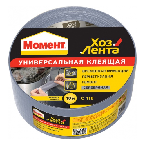 Момент 1161082 имеет серебристый цвет и адгезивную систему на тканевой основе. Лента удобна в использовании и легко рвется руками. Ее применяют для временного ремонта изделий, для упаковки, герметизации и изоляции. Необходимо хранить при температуре от -5ºС до +40ºС. Срок годности — 18 месяцев.