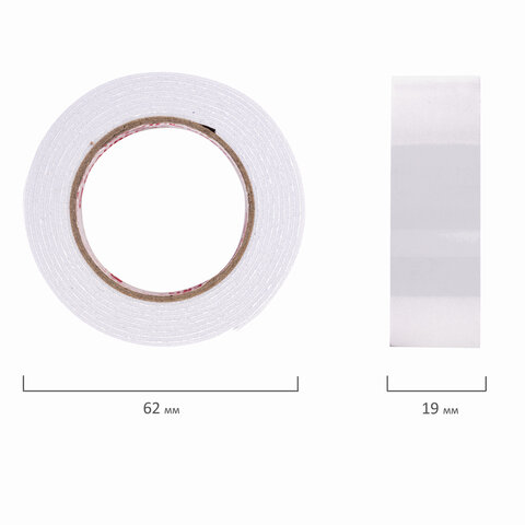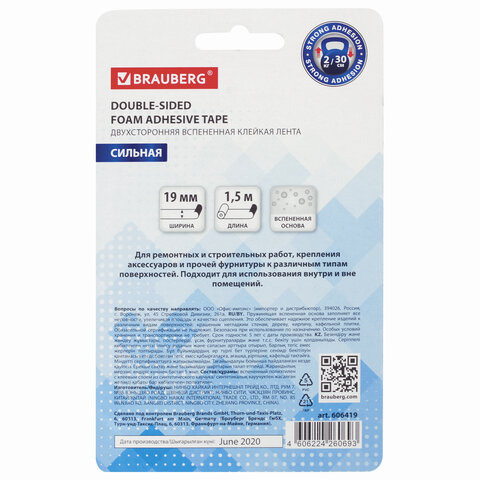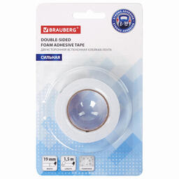 Клейкая лента Двухсторонняя лента 19 мм х 1,5 м, на вспененной основе 1 мм, прочная, BRAUBERG, блистер, 606419 606419СМ