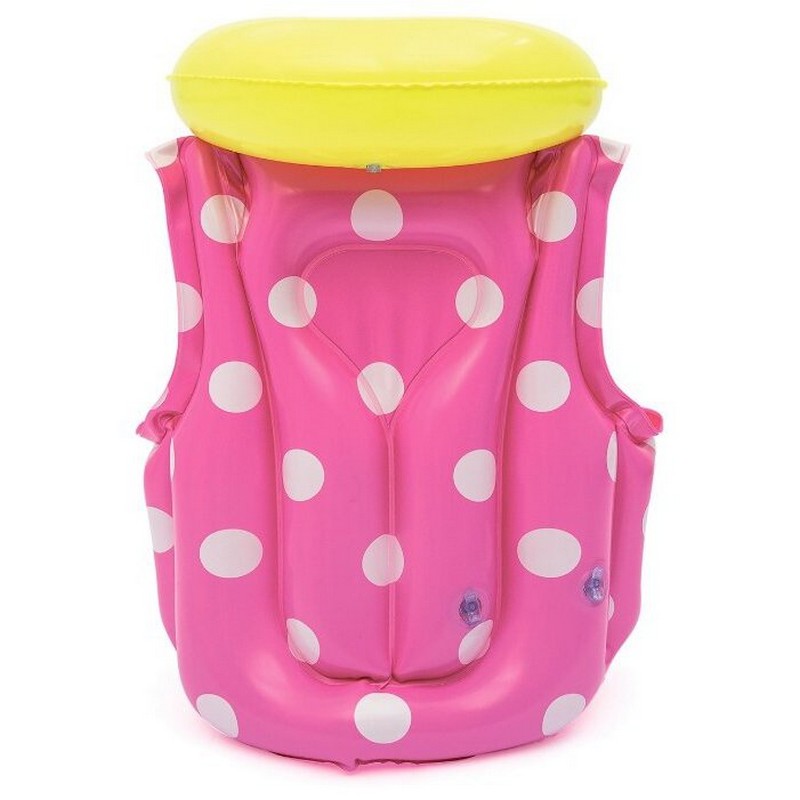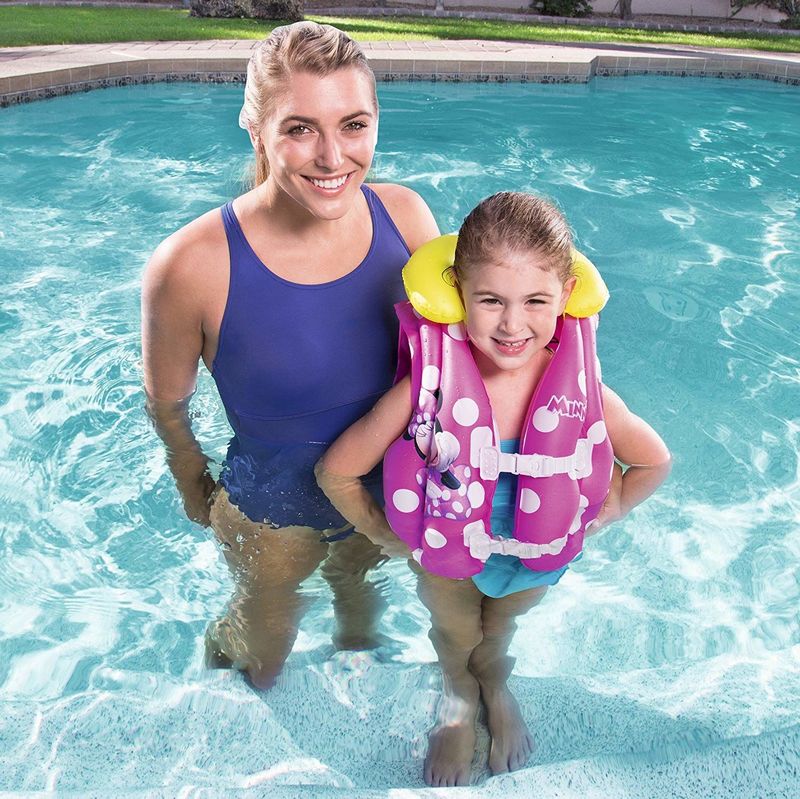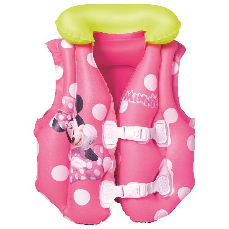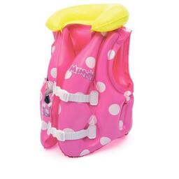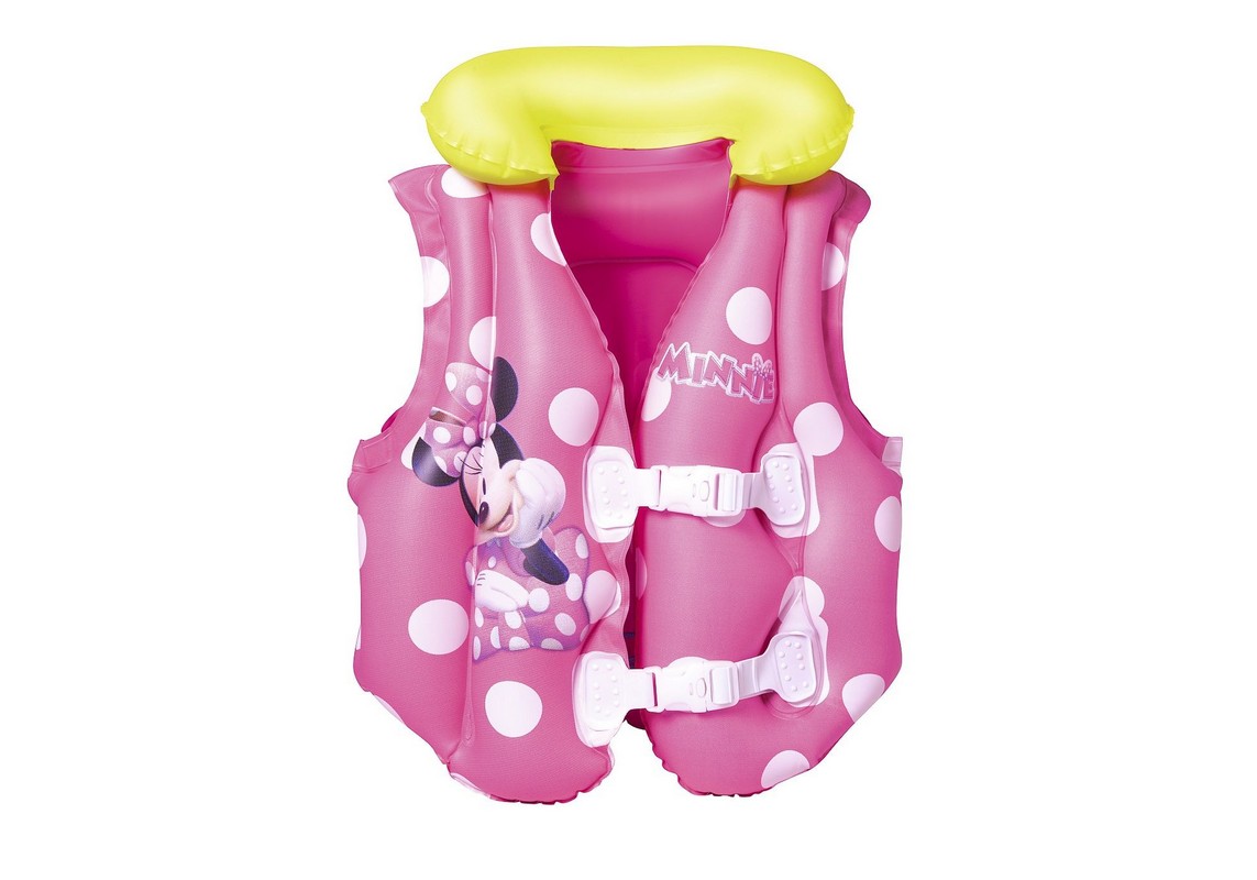 Для активного отдыха ребенка у водоема отличным средством для безопасного купания станет надувной жилет от компании «Bestway». Жилет выполнен из плотного и прочного винила розового цвета с белыми кружочками. Лицевая сторона украшена изображением героини диснеевского мультфильма – крошки Минни.