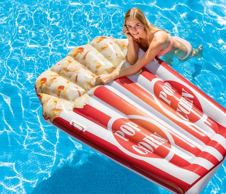 Плавая на таком матрасе, можно легко нагулять аппетит, так как его форма представляет собой пачку с попкорном. Края матраса имеют небольшие бортики, а присутствующие ручки позволят без труда залезть на него, даже будучи в воде.