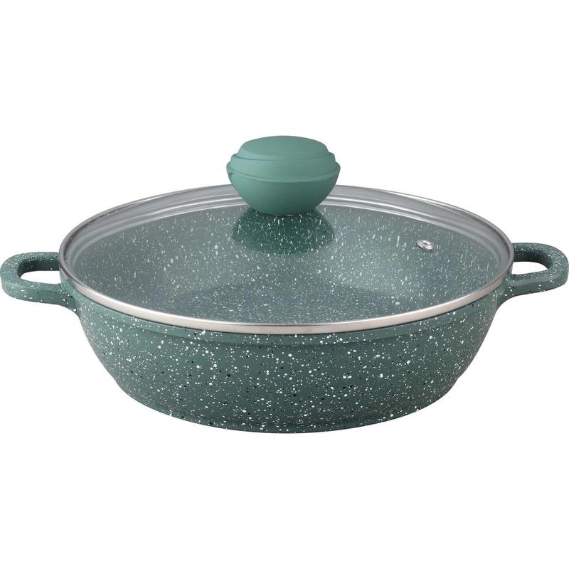 Сотейник 5,3 л со стеклянной крышкой, диаметр 32 см. Толщина стенки 2,0 мм, дна 4,5 мм, высота бортика 7,5 см. Внутри 3-хслойное антипригарное зеленое мраморное покрытие, снаружи 3-х слойное жаропрочное зеленое мраморное покрытие. Ручка крышки с покрытием Soft touch. Ручки сотейника из литого алюминия. Подходит для индукционных плит и чистки в посудомоечной машине. Состав: литой алюминий.