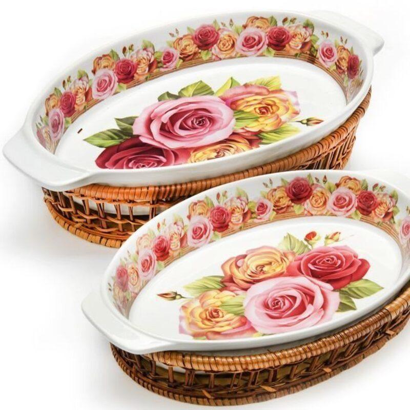 Набор овальных форм Mayer&Boch выполнен из качественного фарфора белого цвета. Поверхность украшена изображением цветов. К каждой форме прилагается плетеная корзинка из ротанга, выполняющая роль оригинальной подставки. Формы прекрасно подойдут для запекания овощей, мяса и других блюд, а благодаря своему оригинальному дизайну, они, несомненно, украсят ваш стол. Посуда не впитывает посторонние запахи, не имеет труднодоступных выступов или изгибов, которые накапливают грязь, и легко чистится. Фарфор выдерживает высокие перепады температуры, поэтому такие формы можно использовать в духовке, микроволновой печи, а также для хранения пищи в холодильнике. Подходит для мытья в посудомоечной машине. В комплекте: 2 формы, 2 плетеные корзинки. Размеры: 35×21×5 см; 28,5×16,5×4 см.