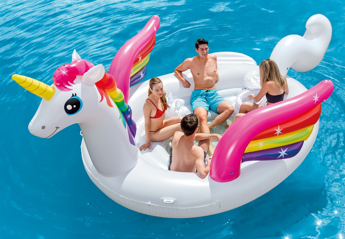 Огромный надувной плавучий остров Intex 57266 в форме единорога, на котором с комфортом разместятся четверо взрослых. Оборудован удобными надувными сидениями, местом для хранения или охлаждения напитков, подлокотниками с четырьмя подстаканниками.