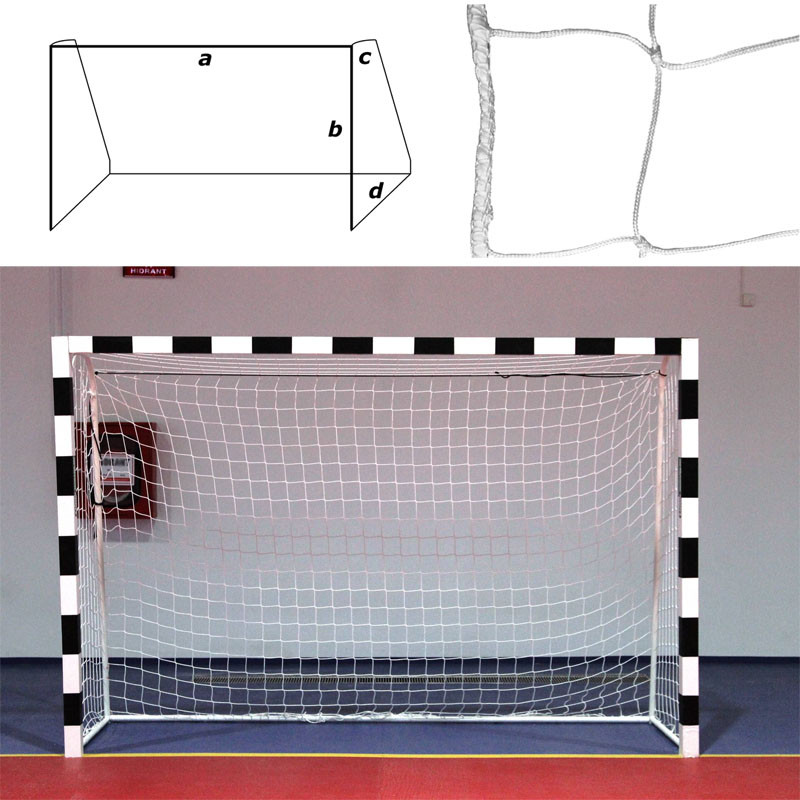Сетка гандбольная/футзальная по форме ворот, размер a:3.0 b:2.0 c:0.8 d:1.5 м, нить 3,5 мм полипропилен (ПП), ячейка 10*10 см, цвет белый. Кромки сетки обработаны оверлоком.