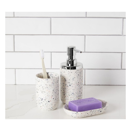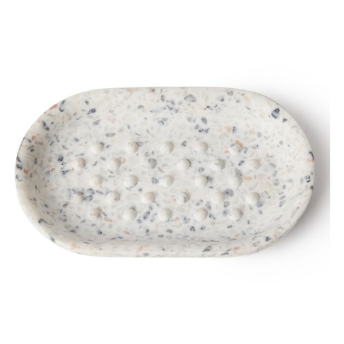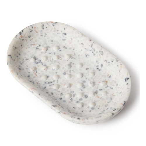 Мыльница Junip terrazzo защитит вашу раковину от пятен и мыльного налета. Благодаря округлым краям мыло удобно хранить и брать в руки, а выступающие ребрам в виде точек обеспечивают ему быструю сушку. Изделие выполнено из синтетической смолы, которая отличается прочностью и стойкостью к повреждениям. Мыльница с декоративной отделкой под мрамор гармонично впишется в интерьер любой ванной комнаты. Ее можно сочетать с другими аксессуарами коллекций Junip terrazzo.