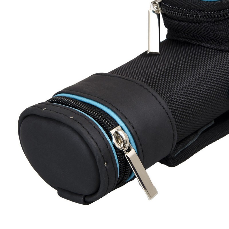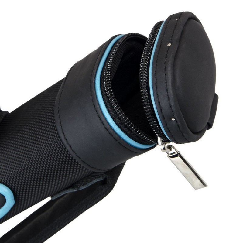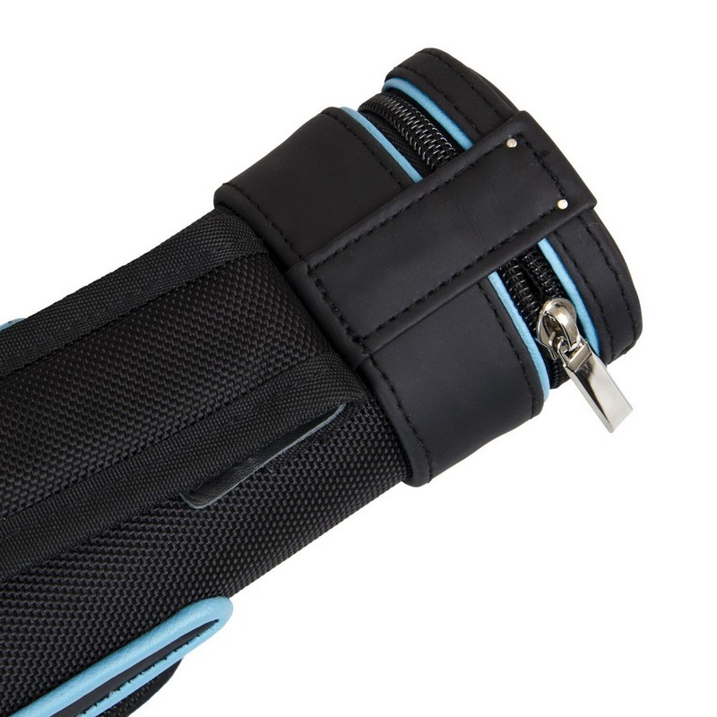 Есть ручка сбоку и наплечный ремень с регулировкой длины. На ремне есть специальная вставка для комфортной носки на плече. Каждая часть кия хранится в отдельном отсеке. С внешней стороны имеются карманы для аксессуаров и удлинителя. Большой карман внутри снабжен дополнительной молнией для надежной фиксации.
