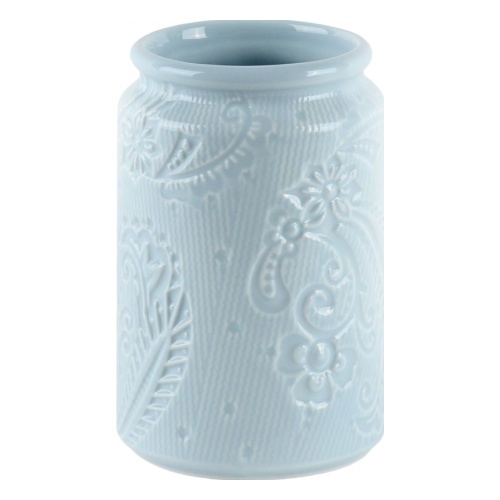 Керамический голубой стакан для зубных щеток, украшенный растительным орнаментом, гармонично сочетается с интерьером в стиле классика или прованс. Для ухода за изделием необходимо использовать мягкую ткань и щадящее моющее средство.