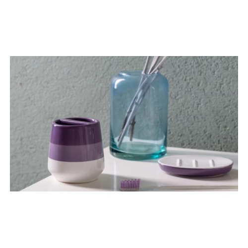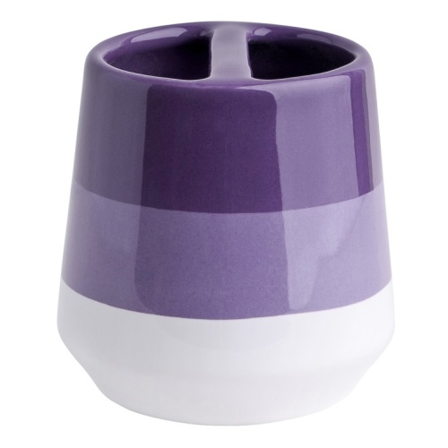 Стакан для зубных щеток в фиолетовую полоску - милый аксессуар для ванной комнаты. Высота и диаметр изделия - 9 см, поэтому оно не займет много места. Стакан, выполненный из керамики, требует бережной эксплуатации: его нельзя подвергать воздействию очень высоких или низких температур и очищать едкими моющими средствами.