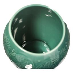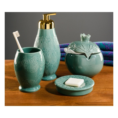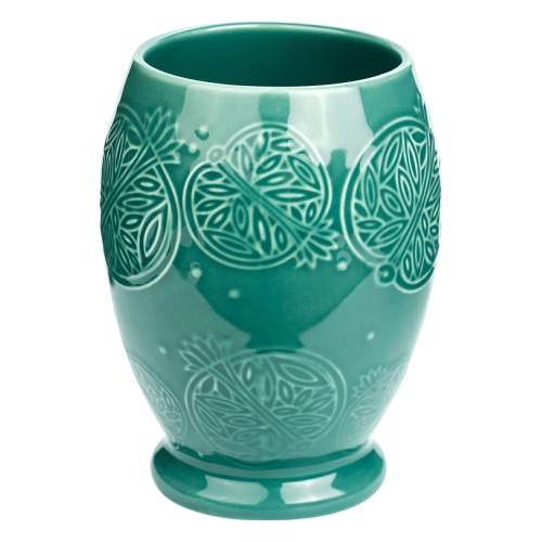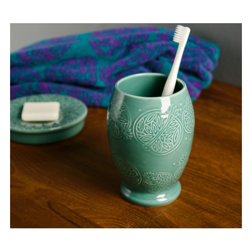 Керамический стакан для зубных щёток зелёного цвета. Имеет размер: 7,2 см в диаметре, 12 см в высоту. Достаточно широкий верх изделия позволяет разместить в нём несколько зубных щёток и тюбик с пастой. Рельефный рисунок на внешней стороне стакана и его расцветка отлично сочетаются со всеми элементами коллекции Fairytale: занавесками для ванной, ковриками, крючками и настольными аксессуарами.