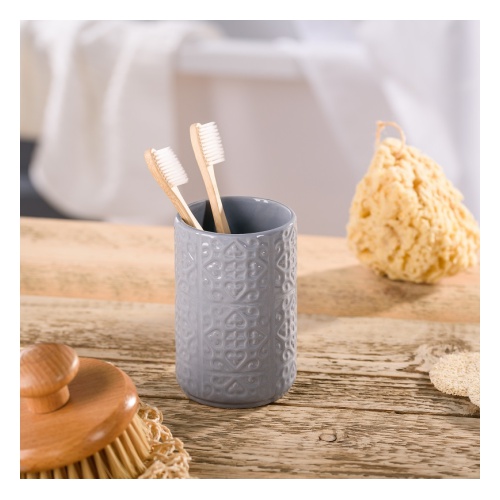 Стильный керамический стакан для щеток серого цвета подойдет для любой ванной комнаты. Данная модель очень практична и хорошо сочетается с интерьерами разных стилей. Изделие нужно чистить щадящими моющими средствами и мягкой салфеткой.