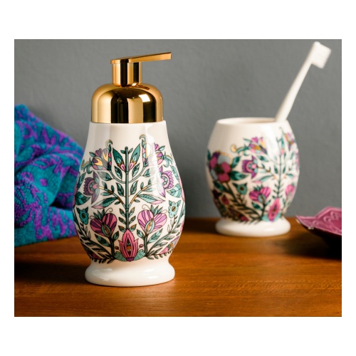 Керамический дозатор для жидкого мыла с ярким растительным орнаментом. Имеет размер 17*10 см. Объём изделия позволяет разместить в нём большое количество любого косметического средства: жидкого мыла, геля для душа шампуня или бальзама. Яркий дизайн, созданный по мотивам русских сказок, составит прекрасную компанию другим аксессуарам из коллекции Fairytale: коврикам для ванной, занавескам для душа, крючкам для полотенец и другим элементам.