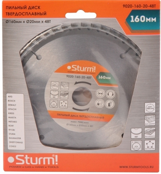 Диск пильный Sturm 9020-160-20-48T Предназначен для продольного и поперечного распила древесины