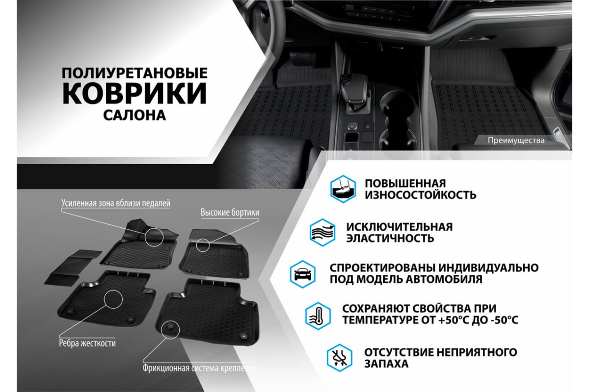 Коврики полностью повторяют геометрию пола и обеспечивают комфорт в эксплуатации.