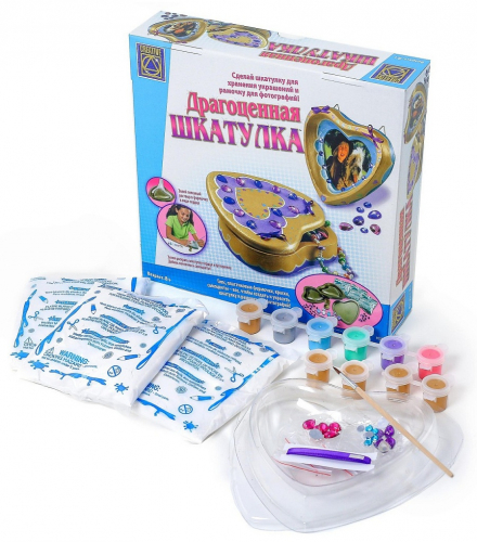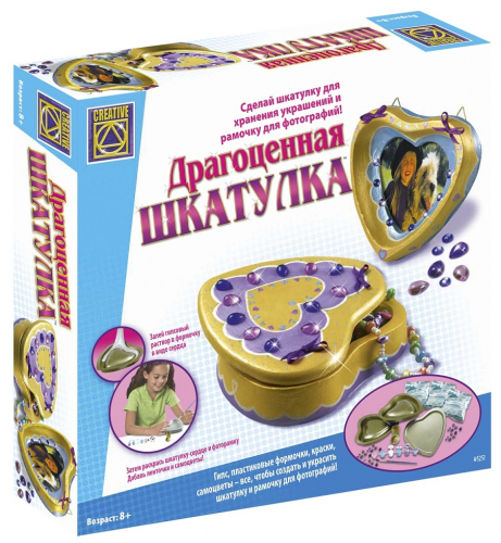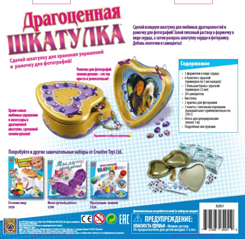 Набор для детского творчества CREATIVE-TOYS-LTD 5251 «Драгоценная шкатулка» дает ребенку возможность с помощью специальных формочек и гипса создать уникальное место хранения своих первых драгоценностей. Сначала он поработает над самим изделием, а с помощью краски, кисточки, декоративных камней и ленты, которые также входят в набор, придаст своему творению неповторимый внешний вид. У шкатулки также будет крышка-фоторамка, в которой можно разместить любимое фото.В каждом комплекте вы найдете три формы, шесть маленьких и одну большую баночку с краской, а также декоративные камни разных цветов, кисточку, два крючка, три пакета с гипсом и ленту.
