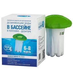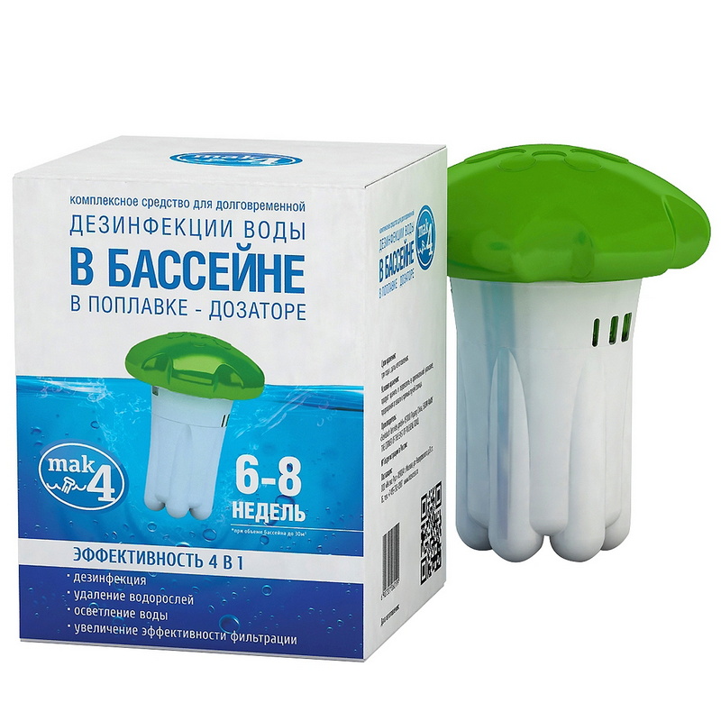 ОСНОВНАЯ ИНФОРМАЦИЯМАК4 - универсальная химия для бассейна, длительной дезинфекции воды в семейных бассейнах INTEX и BESTWAY. В комплект входит мультифункциональный препарат и поплавок-диффузор. Комплексная обработка воды в одном многофункциональном препарате!