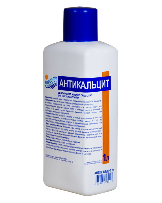 АНТИКАЛЬЦИТ – средство для чистки бассейна, прекрасно удаляющее грязь, известковые отложения, не повреждая поверхность, и будет для Вас незаменимым помощником в нелегкой борьбе за чистоту.Применение:Для чистки чаши бассейна предварительно слить воду. Используют разбавленное (на 1литр препарата – 4 литра воды) или концентрированное средство.Бассейн чистят с помощью щеток и скребков в течение 10-15 минут, затем тщательно смывают теплой водой. При необходимости процедура повторяется. Внимание: Избегайте попадания средства на любые неустойчивые к кислотам материалы (алюминий, кислотонеустойчивые плитка, эмаль и т.д.). Не допускайте длительного воздействия средства на хромированные материалы.При чистке бассейна помещение должно хорошо проветриваться.Меры предосторожности:- беречь от детей;- не смешивать с другими химическими препаратами;- при попадании на кожу и глаза немедленно промыть большим количеством воды, при необходимости обратиться к врачу.Состав: кислота неорганическая, изопропиловый спирт, ПАВ, ингибитор коррозии.Срок годности: один год с даты изготовления.Условия хранения: хранить в прохладном, хорошо проветриваемом помещении и герметично закрытой упаковке; вдали от щелочей и хлорсодержащих препаратов.