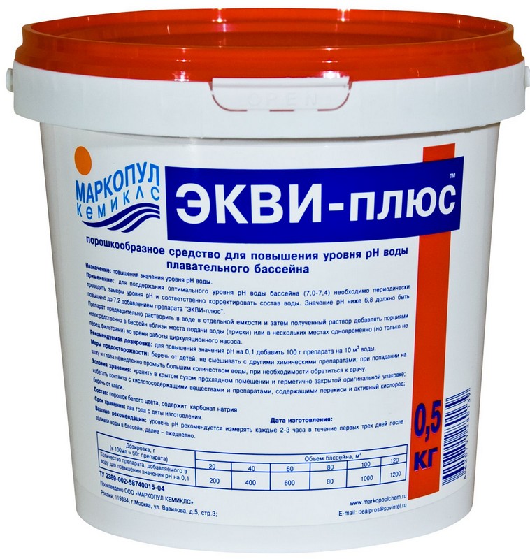 Экви-плюс (порошок) повышает кислотно-щелочной баланс водной среды до нормального уровня. Состав: карбонат натрия; содержание основного вещества — 95%. Порошкообразное средство удобно в применении особенно для ручной дозировки (препарат расфасован в дозировочные пакеты) и добавляется непосредственно в бассейн, вблизи места подачи воды или в нескольких местах одновременно, но только не перед фильтрами.
