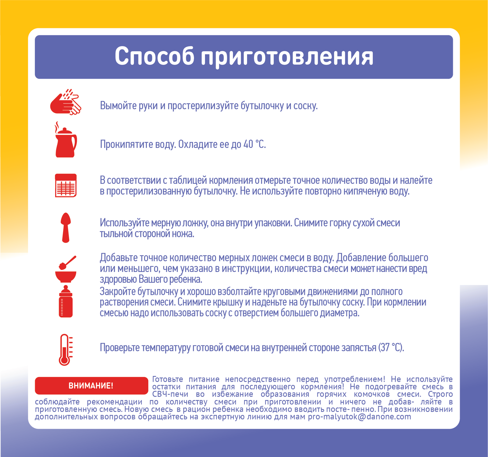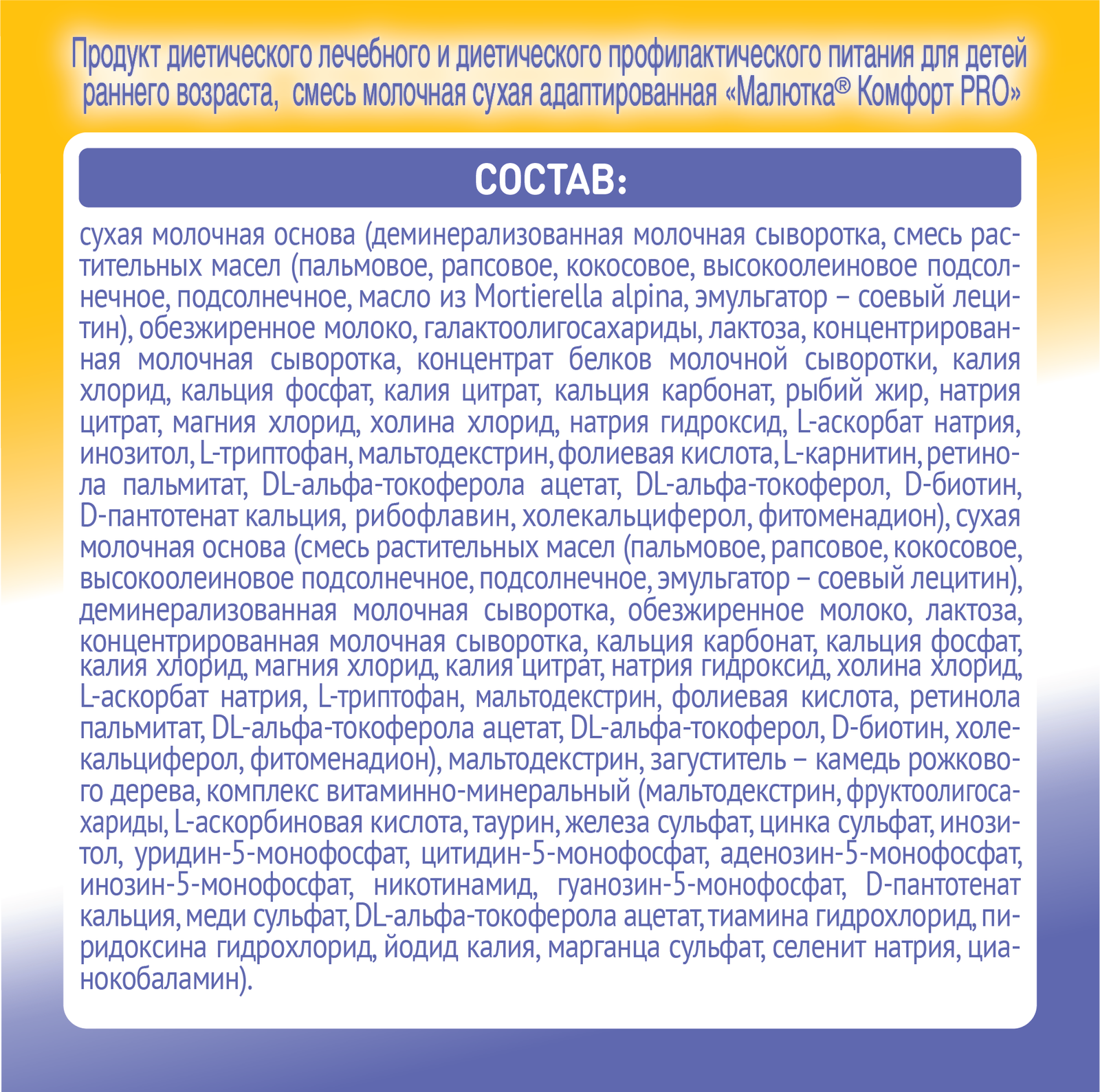 - Состав сухая молочная основа (деминерализованная молочная сыворотка, смесь растительных масел (пальмовое, рапсовое, кокосовое, высокоолеиновое подсолнечное, подсолнечное, масло из Mortierella alpina, эмульгатор – соевый лецитин), обезжиренное молоко, галактоолигосахариды, лактоза, концентрированная молочная сыворотка, концентрат белков молочной сыворотки, калия хлорид, кальция фосфат, калия цитрат, кальция карбонат, рыбий жир, натрия цитрат, магния хлорид, холина хлорид, натрия гидроксид, L-аскорбат натрия, инозитол, L-триптофан, мальтодекстрин, фолиевая кислота, L-карнитин, ретинола пальмитат, DL-альфа-токоферола ацетат, DL-альфа-токоферол, D-биотин, D-пантотенат кальция, рибофлавин, холекальциферол, фитоменадион), сухая молочная основа (смесь растительных масел (пальмовое, рапсовое, кокосовое, высокоолеиновое подсолнечное, подсолнечное, эмульгатор – соевый лецитин), деминерализованная молочная сыворотка, обезжиренное молоко, лактоза, концентрированная молочная сыворотка, кальция карбонат, кальция фосфат, калия хлорид, магния хлорид, калия цитрат, натрия гидроксид, холина хлорид, L-аскорбат натрия, L-триптофан, мальтодекстрин, фолиевая кислота, ретинола пальмитат, DL-альфа-токоферола ацетат, DL-альфа-токоферол, D-биотин, холекальциферол, фитоменадион), мальтодекстрин, загуститель – камедь рожкового дерева, комплекс витаминно-минеральный (мальтодекстрин, фруктоолигосахариды, L-аскорбиновая кислота, таурин, железа сульфат, цинка сульфат, инозитол, уридин-5-монофосфат, цитидин-5-монофосфат, аденозин-5-монофосфат, инозин-5-монофосфат, никотинамид, гуанозин-5-монофосфат, D-пантотенат кальция, меди сульфат, DL-альфа-токоферола ацетат, тиамина гидрохлорид, пиридоксина гидрохлорид, йодид калия, марганца сульфат, селенит натрия, цианокобаламин)