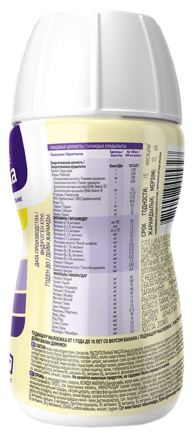- Состав вода; мальтодекстрин; сахароза; растительные масла (соевое масло; высокоолеиновое подсолнечное масло; масло со среднецепочечными триглицеридами (СЦТ)); концентрат молочного белка; фруктоолигосахариды (ФОС); минералы (калия хлорид; калия гидрофосфат; натрия цитрат; трикальция фосфат; магния гидроортофосфат; железа сульфат; цинка сульфат; калия цитрат; марганца сульфат; меди сульфат; калия йодид; натрия молибдат; хрома хлорид; натрия селенат); изолят соевого белка; белок гороха; ароматизаторы (натуральный и ванилин; эмульгаторы (моно- и диглицериды жирных кислот; соевый лецитин); холина битартрат; стабилизатор (ксантановая камедь); витамины (аскорбиновая кислота; ниацинамид; витамин Е; кальция пантотенат; тиамина гидрохлорид; рибофлавин; пиридоксина гидрохлорид; витамина А пальмитат; фолиевая кислота; биотин; филлохинон; витамин D3; цианокобаламин); мио-инозитол; таурин; докозагексаеновая кислота (DHA) из масла C.cohnii; арахидоновая кислота (АA) из масла M.alpina