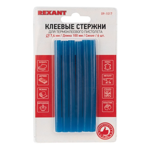 Клеевые стержни REXANT d=7 мм, L=100 мм, синие (упак. 6 шт.) (блистер) 09-1017